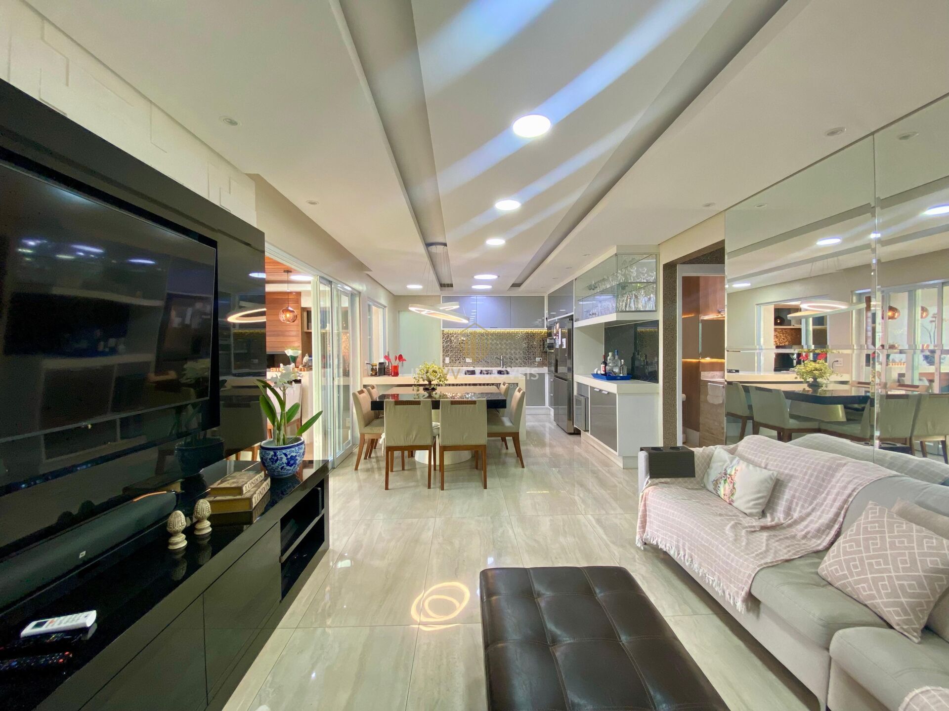 São três dormitórios, todos com suítes, além de sala de estar e jantar integradas, cozinha estilo americana, varanda gourmet com churrasqueira, lavanderia, banheiro social e duas entradas independentes para o imóvel.