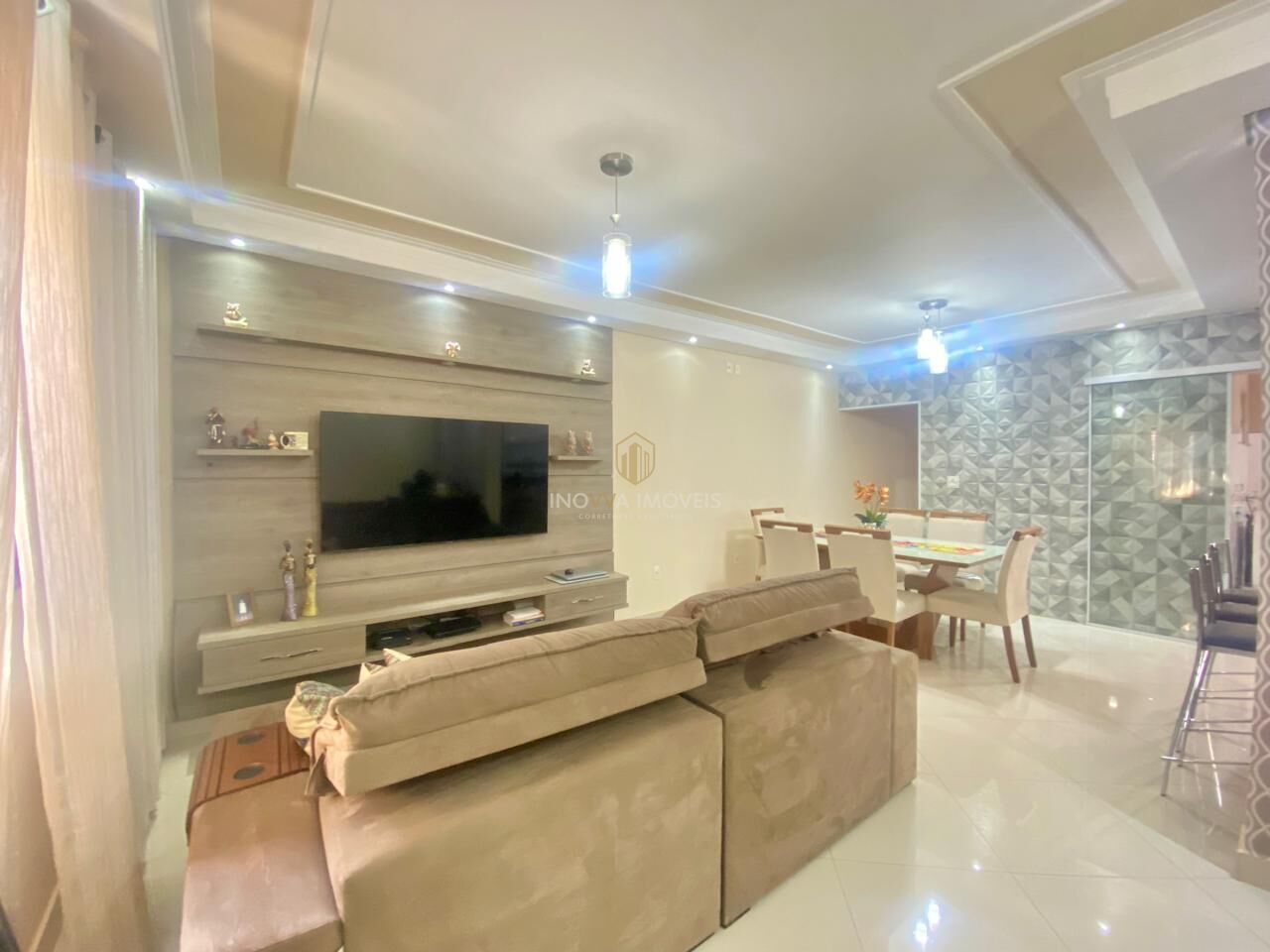 A área social é integrada, com sala de jantar conectada à sala de estar e cozinha planejada com balcão, criando um ambiente acolhedor e funcional.